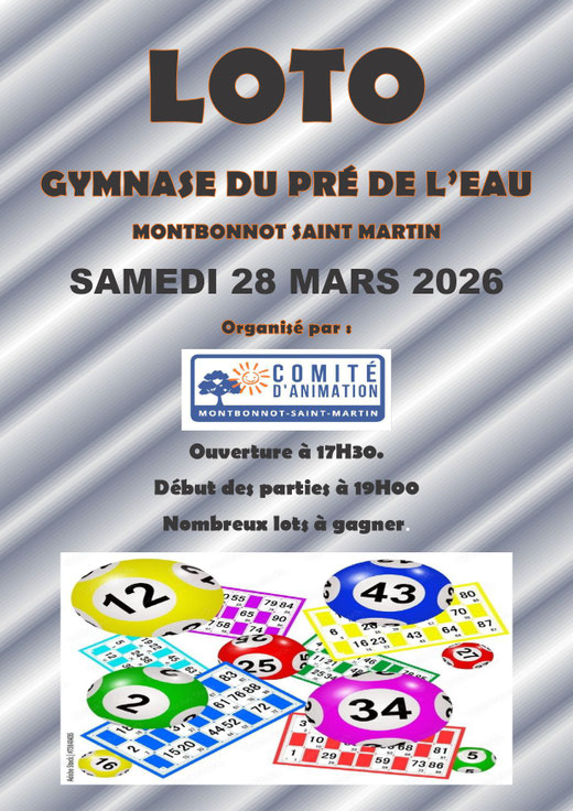Le prochain LOTO organisé par le comité d'animation est prévu le samedi 28 mars 2026 dans le gymnase du pré de l'eau.